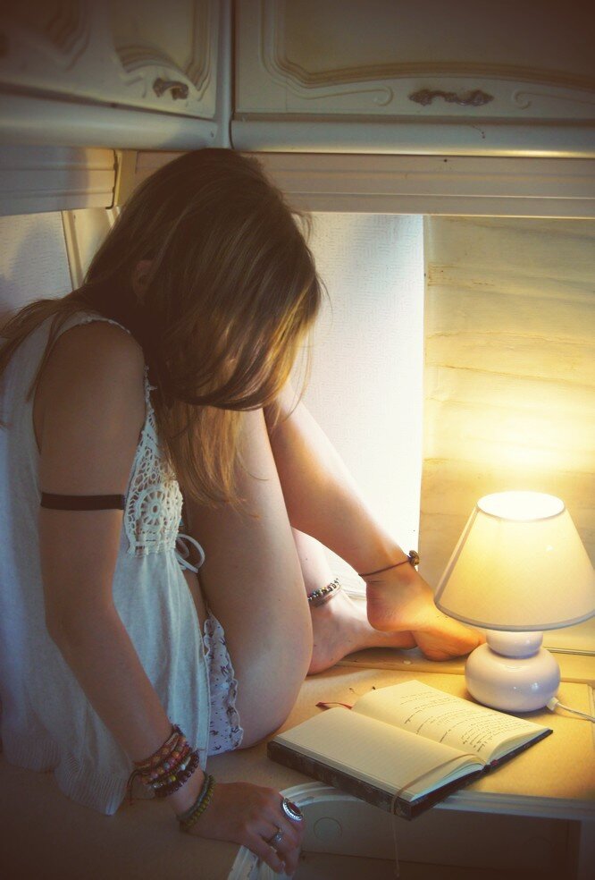 view full sizeThe aftermath of a gorgeous trio's sex! Both men are exhausted from pleasuring her, she needs to read in order to wind down for the night!
